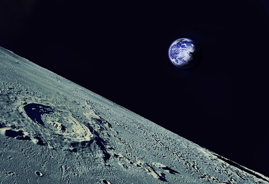 horizon, with the barren landscape of the Moon's surface in the foreground. It